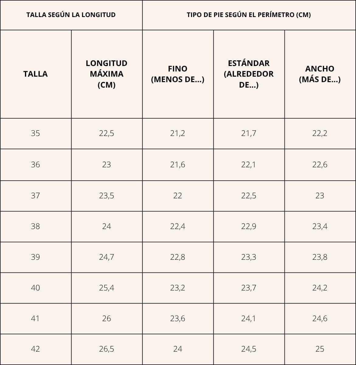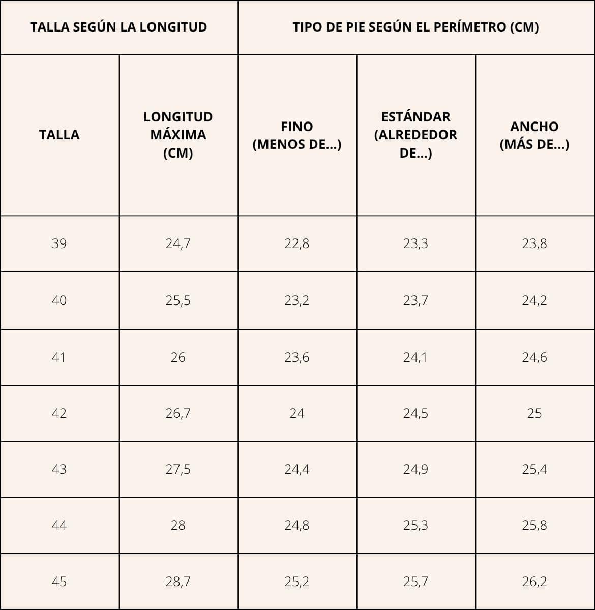 Por ejemplo, el pie izquierdo de Jonathan tiene una longitud de 25,8 cm y una circunferencia de 24 cm. Su pie derecho tiene una longitud de 25,9cm y un perímetro de 24,2. Si nos remitimos a la tabla, estamos en una longitud correspondiente a un 41 y un perímetro correspondiente a un pie estándar. Solo queda seguir los consejos de cada ficha de producto para determinar si coger la talla indicada en la tabla, la talla de arriba o la de abajo.